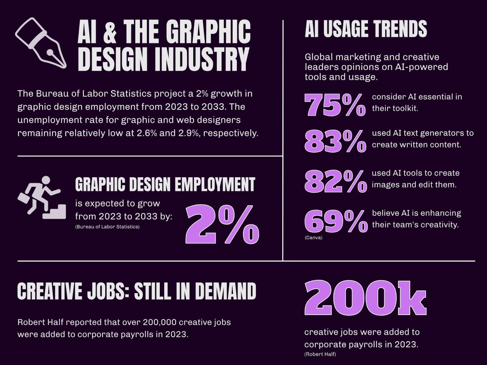 The U.S. Bureau of Labor Statistics projects 2% job growth for graphic designers between 2024 and 2034. That is slower than average, but it is still growing. (U.S. Bureau of Labor Statistics)