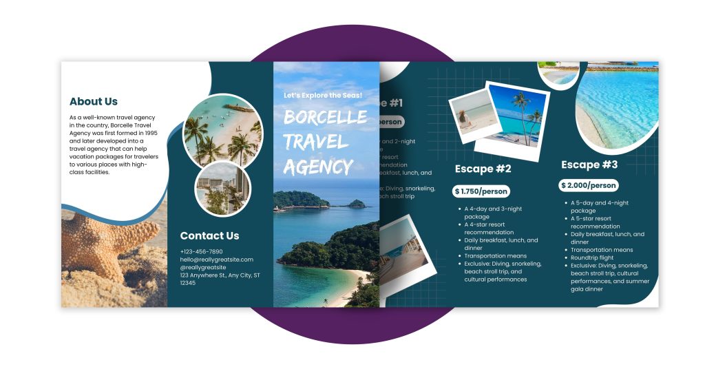 A travel brochure is marketing material (printed or digital) to promote a trip itinerary, tourist spot, holiday destination, resort, or any other travel-related business. You should keep both printed and digital brochures handy since some clients prefer visiting your office to get more details while others prefer getting every information from the comfort of their homes.