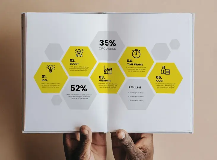 Hands holding an open book displaying an internship program overview with icons and descriptions for apprentice, skills, training, mentors, preparation, and proficiency.Person's hand holding open a book displaying an ESG infographic with sections on Environment, Social, and Governance.Open book held by a hand displaying colorful business strategy and step-by-step guides with icons and text on two pages.Open brochure on blue surface showing 'Our Services' infographic listing Ideas, Content, Cold DM, Communities, and Growth with icons and brief descriptions.Infertility risk factors infographic listing age, obesity, alcohol, infection, smoking, and exposure to toxin with icons on a dark blue and purple background.Infographic showing employee growth with three colored vertical bars labeled 'Second runner up,' 'Winner,' and 'First runner up,' each with an icon of a person climbing upward.